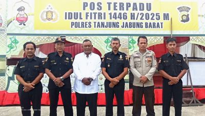 Tanjab Barat – Kapolres Tanjung Jabung Barat AKBP Agung Basuki, S.IK., MM bersama sejumlah Perwira Jawatan Utama (PJU) melakukan peninjauan ke sejumlah Pos Pengamanan dan Pos Pelayanan dalam rangka Operasi Ketupat 2025. Kunjungan ini bertujuan memastikan keamanan dan kelancaran arus mudik Lebaran di wilayah hukum Polres Tanjab Barat.